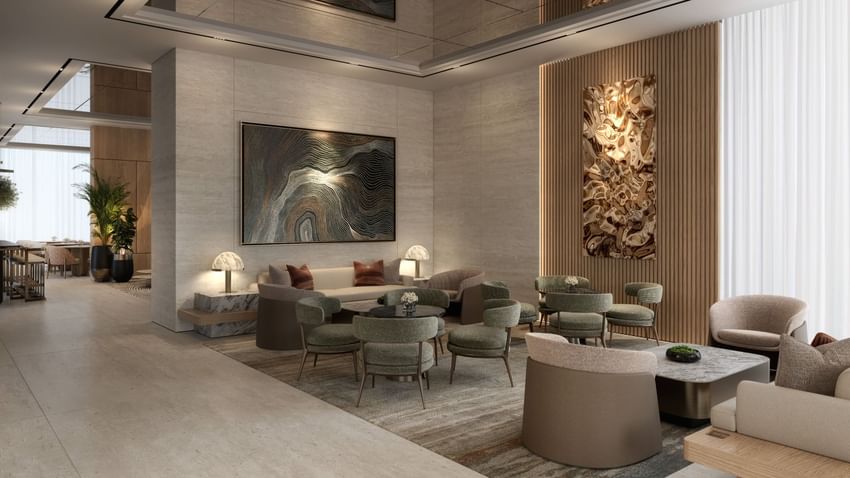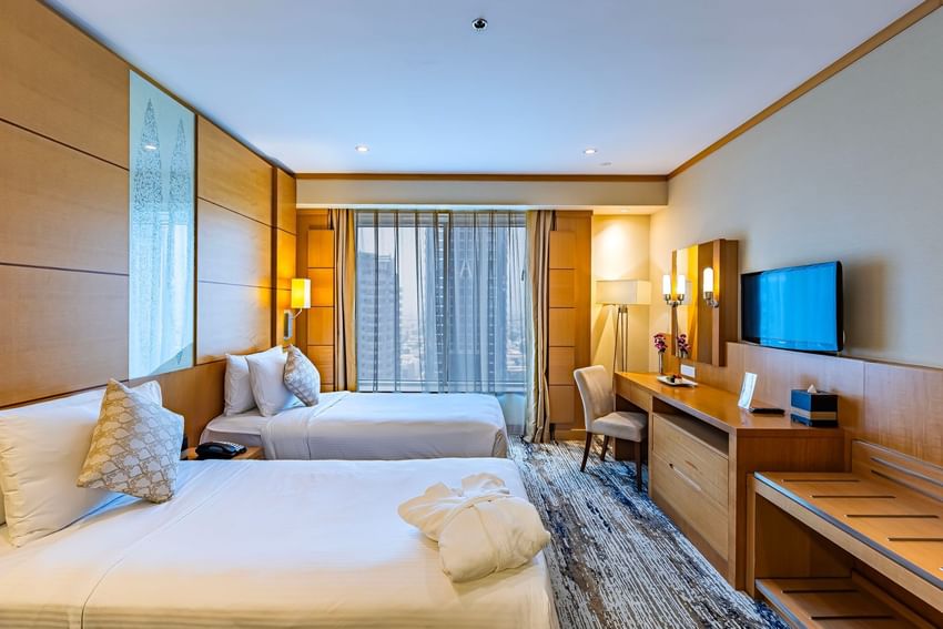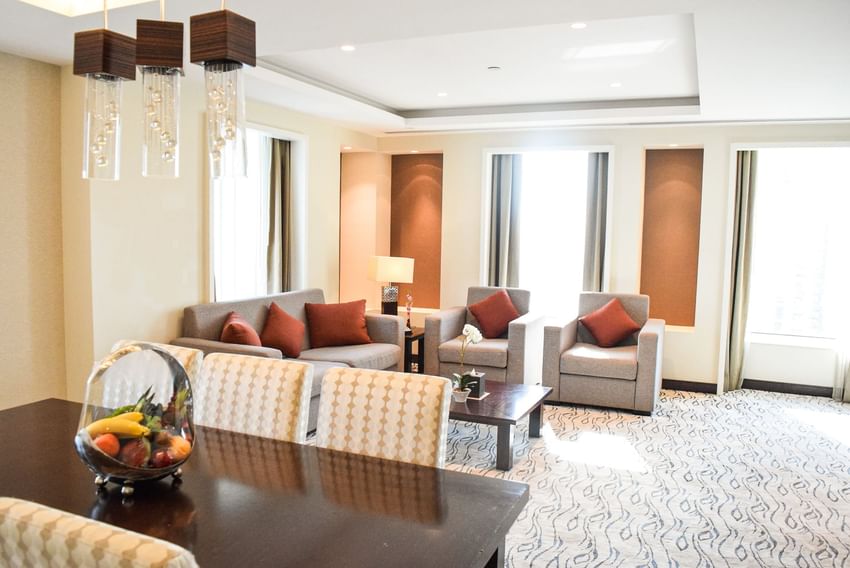 These spacious one-bedroom Dubai hotel suites combine sleek, modern decor with everyday functionality, highlighted by light and airy finishes and large landscape windows. Guests will enjoy an expansive living room with a 40" flat screen TV, dining area for 4 people and a large work desk.
